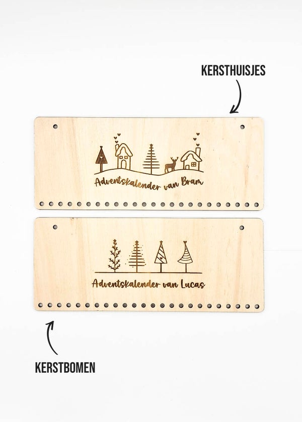 Het bordje wordt lasergegraveerd met de naam van het kind(jes) en 24 openingen waaraan je de verrassingen kan hangen.